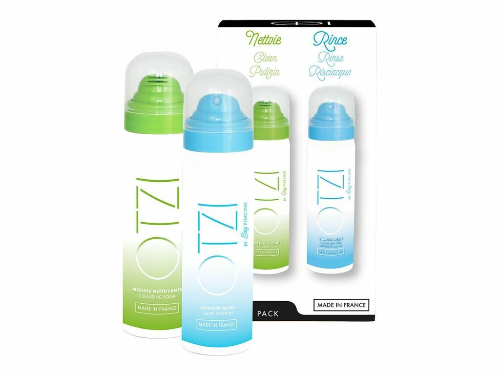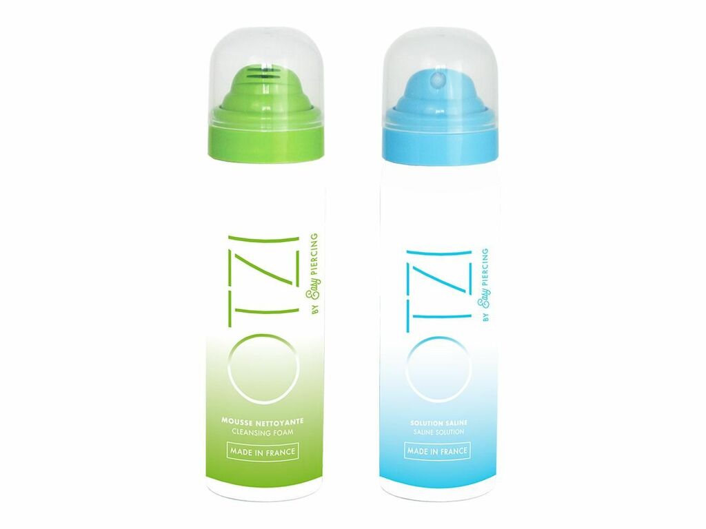 Rengöringsskummet används som daglig rengöring för optimal hygien, medan koksaltlösningen används för återfuktning och daglig sköljning av piercingen.